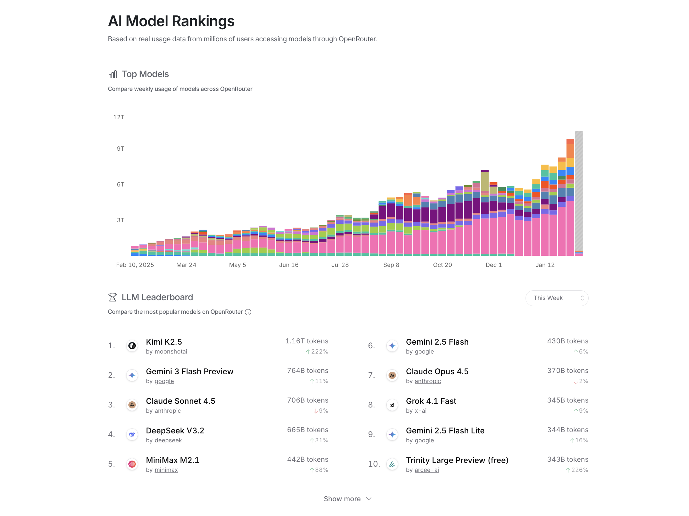 وقد حافظ Kimi K2.5 على المركز الأول في عدة قوائم تصنيف على منصة OpenRouter، بما في ذلك النماذج الأعلى أسبوعيًا، والبرمجة، واستدعاء الأدوات، وتصنيفات استخدام Python. ومن أبرز الإنجازات، تصدر النموذج قائمة “الأداء الأسبوعي العام” التي تُعد المؤشر الأدق على حجم الطلب، حيث بلغ استخدامه 1.16 تريليون وحدة رمزية (tokens)، متفوقًا بذلك على منافسيه المغلقين Gemini 3 Flash Preview وClaude Sonnet 4.5 بفارق يزيد عن 50%.