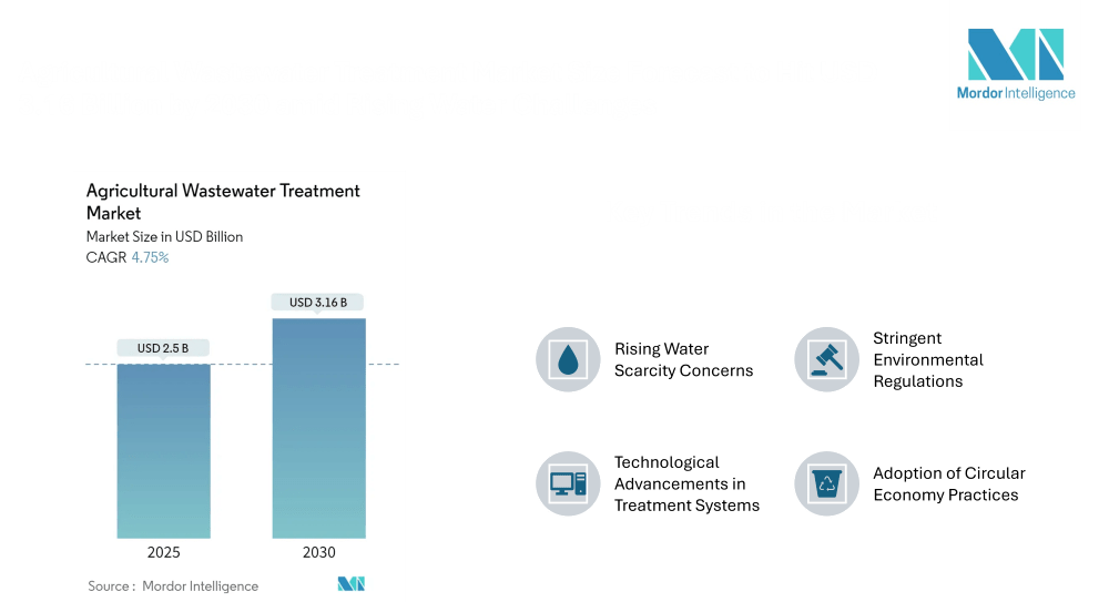 According to the latest Mordor Intelligence analysis, the Agricultural Wastewater Treatment Market Size is projected to grow from an estimated USD 2.50 billion in 2025 to USD 3.16 billion by 2030, representing a compound annual growth rate (CAGR) of around 4.75 %. This upward trajectory is propelled by deepening concerns over dwindling freshwater supplies and escalating agricultural water demand.