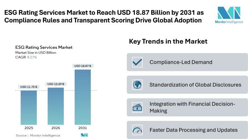 The ESG rating services market size was valued at USD 11.72 billion in 2025 and is estimated at USD 12.69 billion in 2026, with the market forecast indicating it will reach USD 18.87 billion by 2031, growing at a CAGR of 8.27%. This trajectory highlights steady market growth supported by compliance-driven demand, expanding disclosure frameworks, and rising investor scrutiny. Across the ESG rating services industry, institutions are moving away from narrative sustainability reporting toward structured, measurable disclosures. Regulatory bodies worldwide are mandating standardized reporting formats, which increases the need for reliable ratings, datasets, analytics, and verification tools.