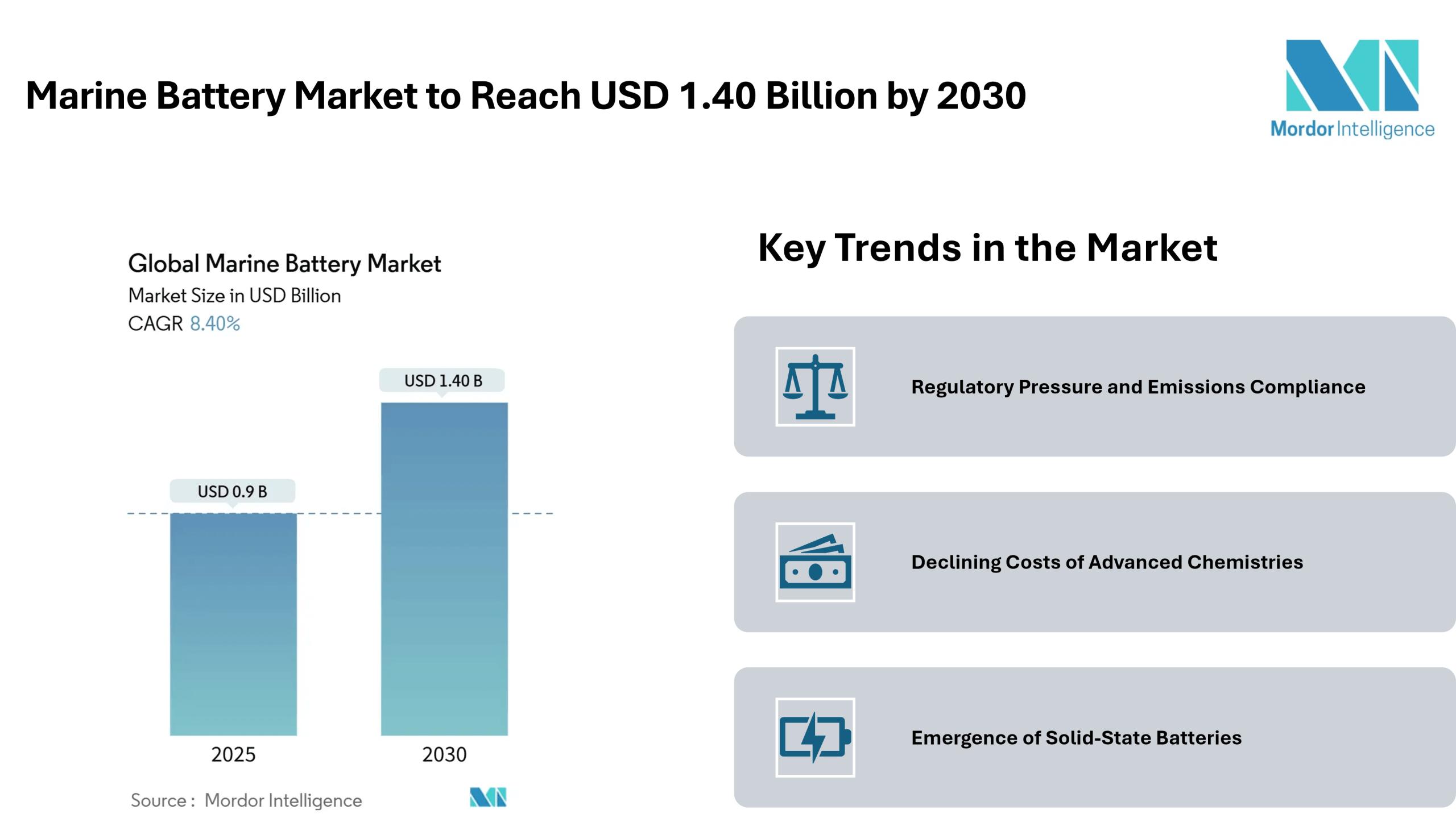 The marine battery market is forecast to expand significantly, with its market size projected to grow from USD 0.9 billion in 2025 to approximately USD 1.40 billion by 2030, according to a recent intelligence report by Mordor Intelligence. This represents a compound annual growth rate (CAGR) of around 8.40 percent during the forecast period. Key trends fueling this growth include stricter emissions regulations, innovations in battery chemistry, and growing investments in electric and hybrid marine propulsion systems.