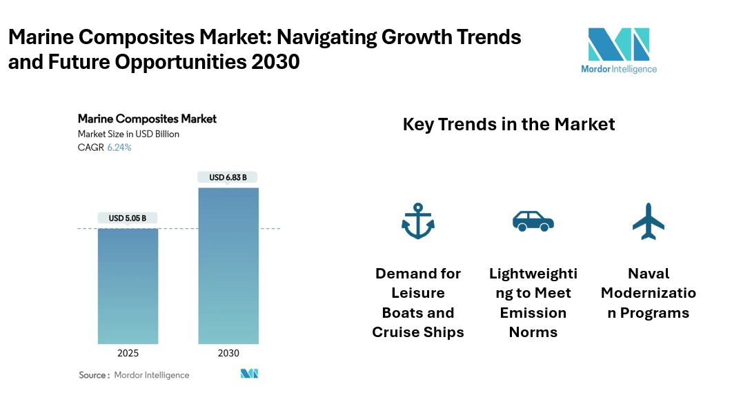 The global Marine Composites Market is projected to grow from USD 5.05 billion in 2025 to USD 6.83 billion by 2030, registering a CAGR of 6.24%. The industry is witnessing a steady shift from conventional steel and aluminum toward advanced composite systems. These materials not only extend vessel life but also reduce operating costs, improve fuel efficiency, and support electrification strategies. With demand rising across leisure boating, defense modernization, and commercial fleets, the marine composites market is positioned for sustained expansion.