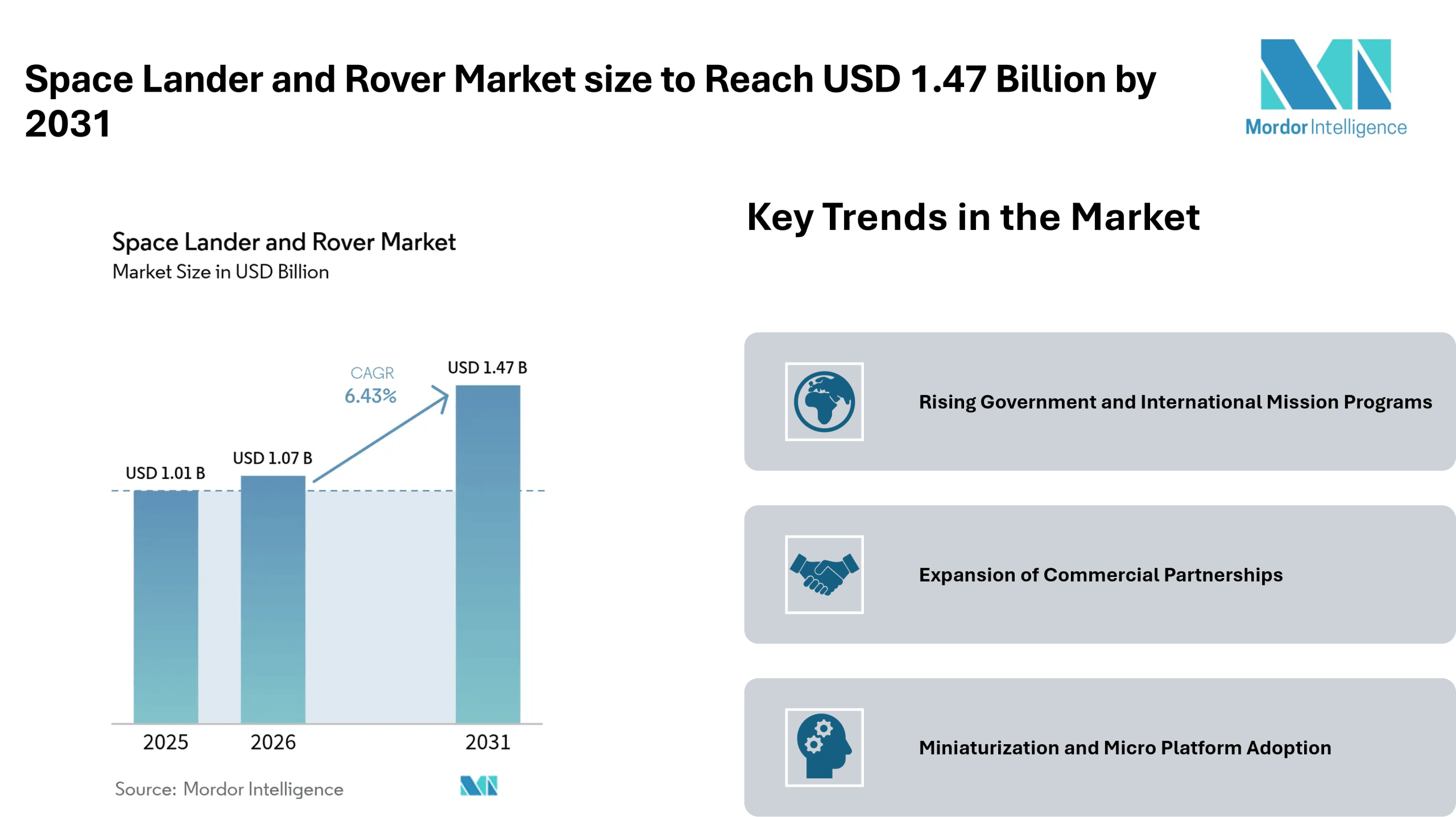 According to Mordor Intelligence, the space lander and rover market size is projected to grow from USD 1.01 billion in 2025 to USD 1.07 billion in 2026, and further reach USD 1.47 billion by 2031, registering a CAGR of 6.43% during the forecast period. This upward trajectory highlights consistent market growth, supported by long-term exploration programs and steady funding pipelines.